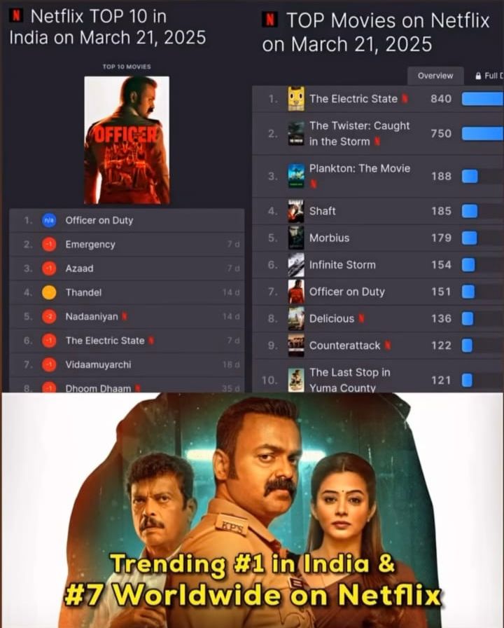 മലയാളികളുടെ പ്രിയ താരം കുഞ്ചാക്കോ ബോബന്റെ കരിയർ ബെസ്റ്റ് ചിത്രം ഓഫീസർ ഓൺ ഡ്യൂട്ടി അഞ്ചാം വാരത്തിലേക്കു കടക്കുമ്പോൾ തിയേറ്ററിലും ഓ റ്റി യിലും ഒരുപോലെ തരംഗംകുകയാണ്. മുപ്പത്തി അഞ്ചാം ദിവസത്തിലേക്ക് പിന്നിടുന്ന ചിത്രം ഇപ്പോഴും തിയേറ്ററുകളിൽ നാൽപ്പത്തി അഞ്ചിൽപ്പരം സ്ക്രീനുകളിൽ പ്രദർശന വിജയം നേടുകയാണ്. കഴിഞ്ഞ ദിവസം ഓഫീസർ ഓൺ ഡ്യൂട്ടി ഓ റ്റി റ്റി പ്ലാറ്റ് ഫോമായ നെറ്റ്ഫ്ലിക്സിൽ റിലീസായിരുന്നു, റിലീസായ ആദ്യ ദിനം തന്നെ നെറ്ഫ്ലിക്സിൽ ഇന്ത്യയിലെ ഒന്നാം സ്ഥാനം ഓഫീസർ ഓൺ ഡ്യൂട്ടി കരസ്ഥമാക്കി.നെറ്റ്ഫ്ലിക്സിൽ വേൾഡ് വൈഡ് ഏഴാം സ്ഥാനത്തും ഇന്ത്യയിലും ഗൾഫിലും ഒന്നാം സ്ഥാനത്തെത്തി പ്രേക്ഷകർക്കിടയിൽ തരംഗമായി മാറുകയാണ് ഓഫീസർ ഓൺ ഡ്യൂട്ടി. ഓ റ്റി യിൽ റിലീസ് ചെയ്തിട്ടും പൂർണ്ണമായും തിയേറ്റർ എക്സ്പീരിയൻസ് ഡിമാൻഡ് ചെയ്യുന്ന ചിത്രമായതിനാൽ പ്രേക്ഷകർ തിയേറ്ററുകളെയും നിറഞ്ഞ സദസ്സാക്കുന്നു. ഓ റ്റി റ്റി റിലീസ് ചെയ്ത ശേഷവും തിയേറ്ററിൽ കിട്ടുന്ന സ്വീകാര്യത പ്രേക്ഷകർ നൽകുന്ന ഏറ്റവും വലിയ അംഗീകാരമാണ് എന്ന് കുഞ്ചാക്കോ ബോബൻ അഭിപ്രായപ്പെട്ടു.