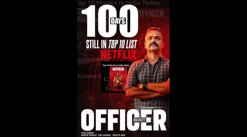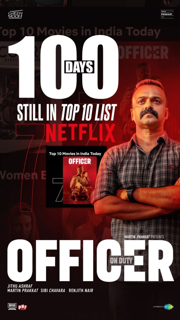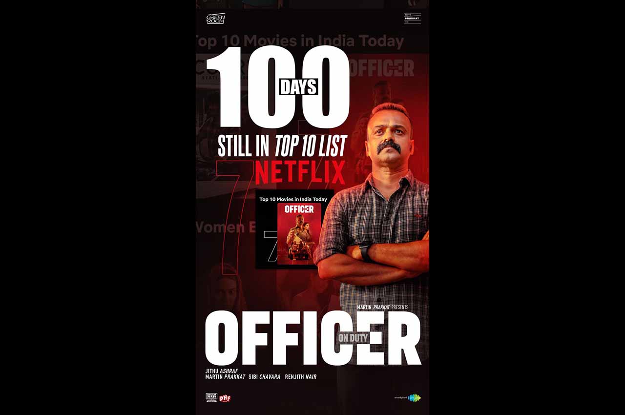 ഈ വർഷത്തെ മലയാള സിനിമാ റിലീസുകളിൽ ബ്ലോക്ക്ബസ്റ്റർ വിജയം നേടിയ ഓഫീസർ ഓൺ ഡ്യൂട്ടി നൂറാം ദിനം പിന്നിടുകയാണ്. തിയേറ്ററുകളിൽ കളക്ഷനിൽ തരംഗം തീർത്ത് നിരൂപകരുടെയും പ്രേക്ഷകരുടെയും മുക്തകണ്ഠമായ പ്രശംസ പിടിച്ചു പറ്റിയ ഓഫീസർ ഓൺ ഡ്യൂട്ടി ഓ റ്റി റ്റി പ്ലാറ്റ്ഫോമിലും തരംഗമാകുകയാണ്. ഫെബ്രുവരി റിലീസ് ആയി തിയേറ്ററുകളിൽ എത്തിയ ഓഫീസർ ഓൺ ഡ്യൂട്ടി മാർച്ച് ഇരുപതിന് നെറ്റ്ഫ്ലിക്സിൽ റിലീസ് ആയിരുന്നു. ഓ റ്റി റ്റി റിലീസ് ആയി രണ്ടു മാസം കഴിഞ്ഞിട്ടും നെറ്റ്ഫ്ലിക്സിൽ ഇന്ത്യയിലെ ആദ്യ മികച്ച പത്തു ചിത്രങ്ങളിൽ തുടർച്ചയായി ഡ്യൂട്ടി തുടർന്ന് തരംഗമാകുകയാണ് കുഞ്ചാക്കോ ബോബൻ ചിത്രം ഓഫീസർ ഓൺ ഡ്യൂട്ടി. മറ്റു ഭാഷകളിൽ വൻ വിജയം നേടിയ ചാവ, ഡ്രാഗൺ, ദേവ എന്നെ ചിത്രങ്ങളൊക്കെ ടോപ് പത്തിൽ നിന്ന് പുറത്തായപ്പോൾ ഓഫീസർ ഇപ്പോഴും ഡ്യൂട്ടി തുടരുകയാണ്.