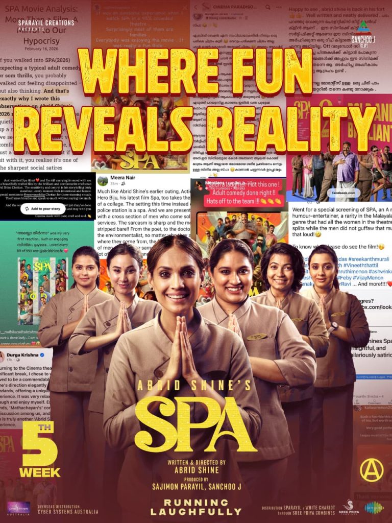 കഴിഞ്ഞ കുറച്ച് വർഷങ്ങളിൽ മലയാള സിനിമയിൽ വന്ന ഏറ്റവും കൂർമ്മമായ സാമൂഹിക വ്യംഗ്യങ്ങളിൽ ഒന്നാണ് ‘സ്പാ ‘. ഇത് ലൈംഗികതയെ കുറിച്ചല്ല, മറിച്ച് കപടത, ആഗ്രഹങ്ങൾ, നമ്മൾ നടിക്കുന്ന വ്യക്തിത്വവും യഥാർത്ഥത്തിൽ നമ്മൾ ആരാണെന്നും തമ്മിലുള്ള അന്തരം എന്നിവയെക്കുറിച്ചാണ്.പറയുന്നത്… അഖിൽ പിള്ള കുറിച്ചു.